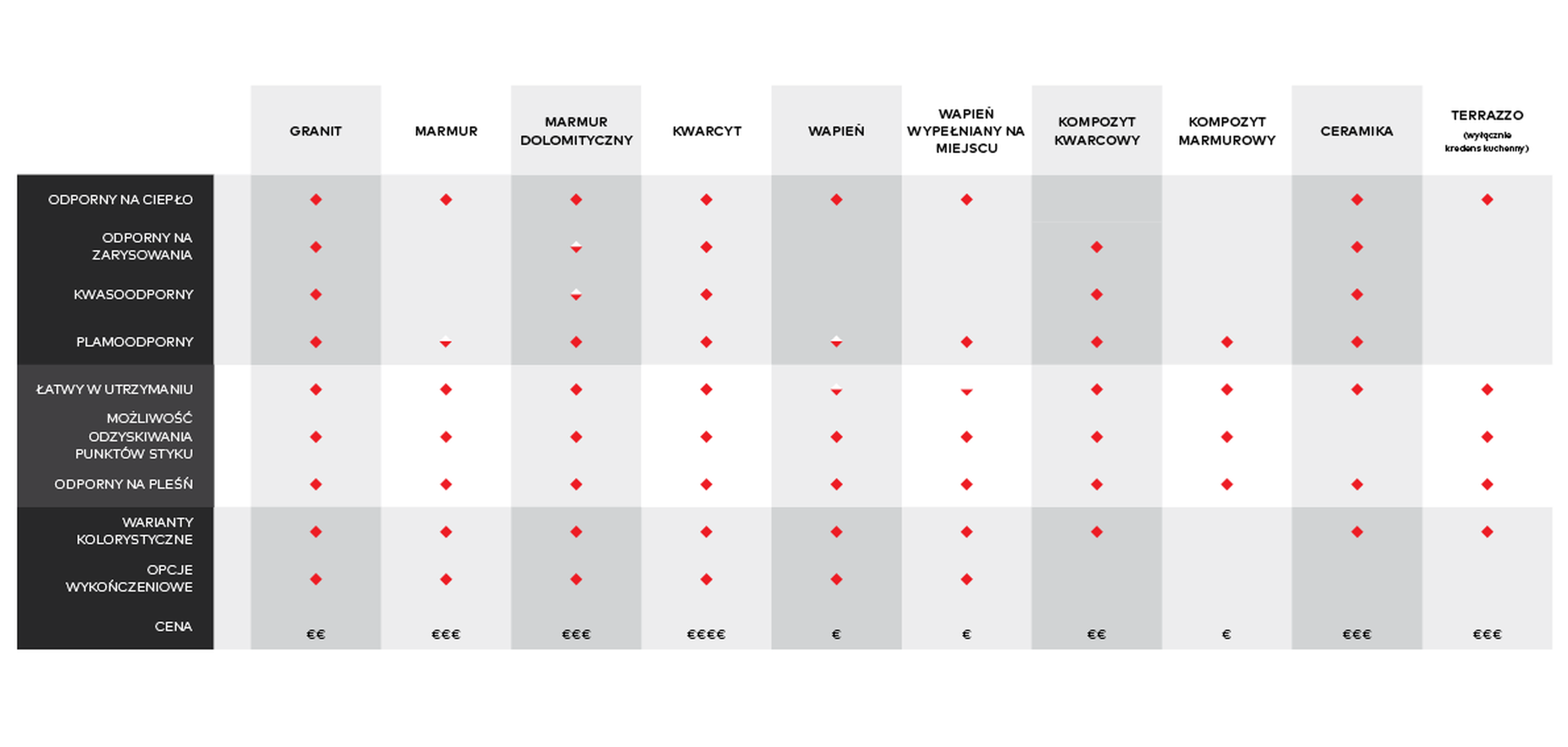 Każdy materiał posiada specyficzne właściwości. Niektóre materiały lepiej nadają się do określonych zastosowań w kuchni (blat roboczy, panele, podłoga, stół, itd.) niż inne.