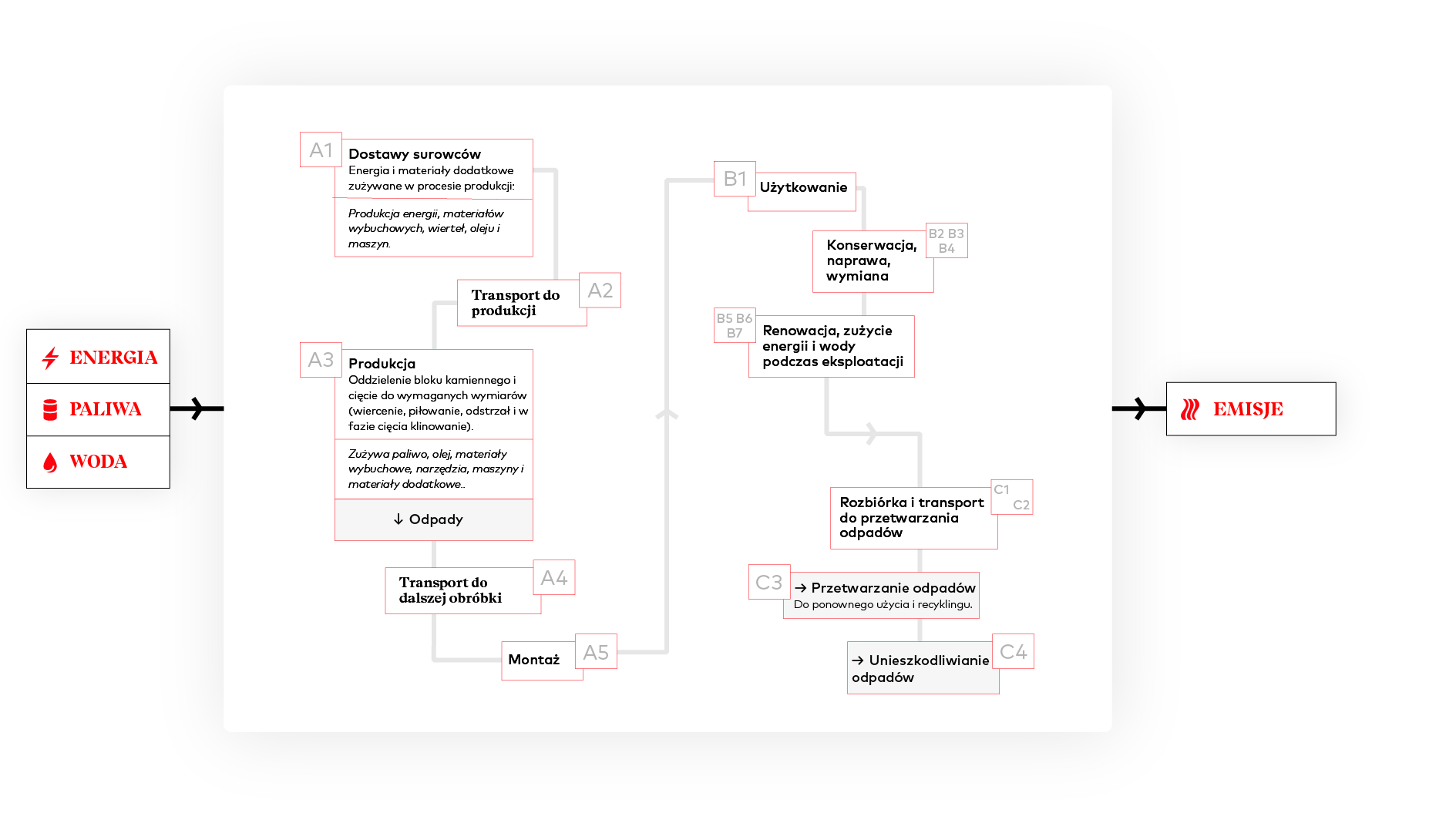 EPD działa jak karta tożsamości produktu, analizując każdy etap jego cyklu życia — od wydobycia surowców aż po jego utylizację (koniec życia – „od kołyski po grób”) lub ponowne wykorzystanie (recykling lub downcykling). Gwarantuje to kompleksową ocenę wpływu środowiskowego i umożliwia przejrzystą komunikację. Dzięki precyzyjnym wskaźnikom EPD stanowi obiektywną podstawę do porównania wpływu środowiskowego różnych materiałów, wspierając świadome i zrównoważone wybory zarówno dla firm, architektów, jak i konsumentów.