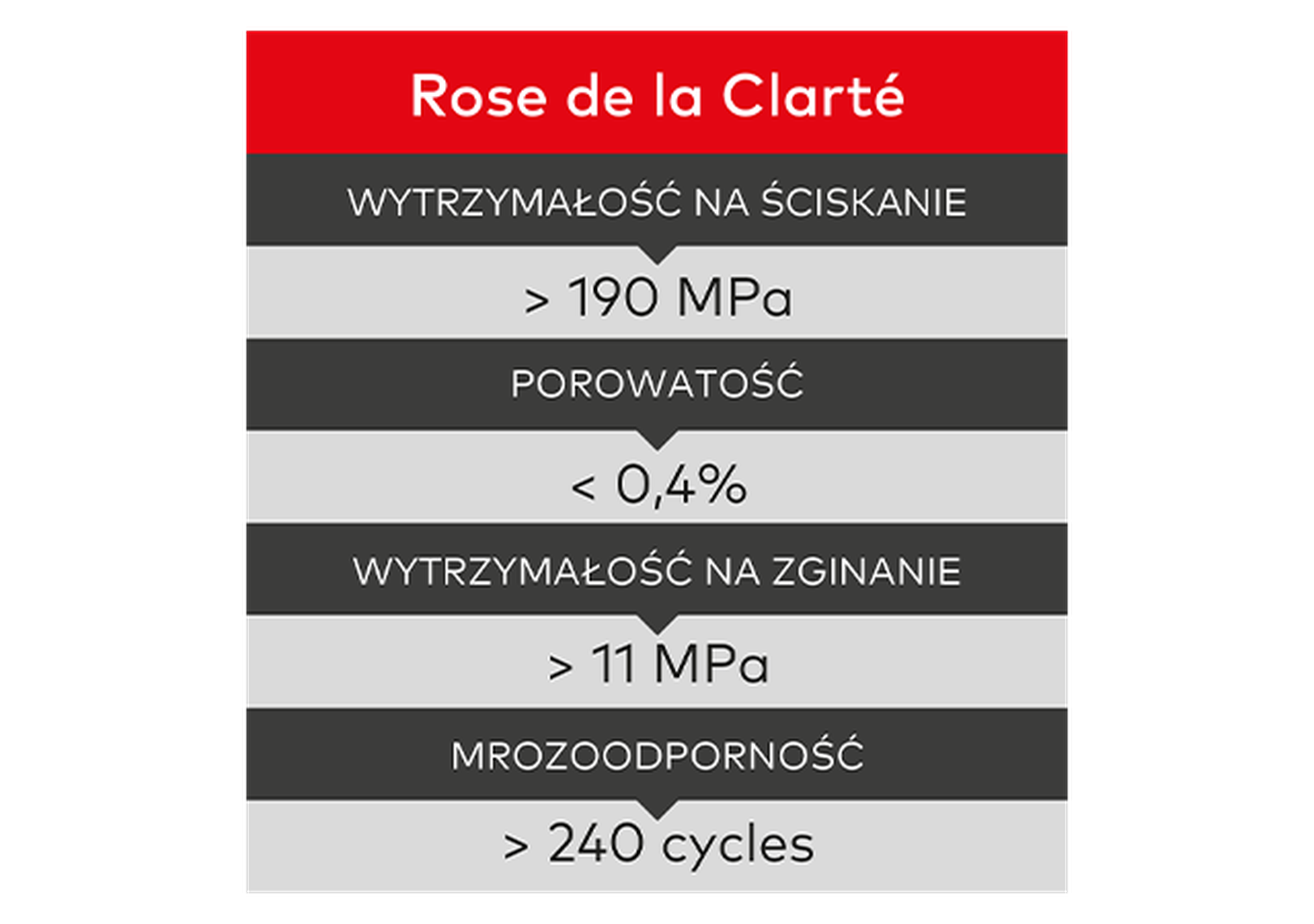Rose de la Clarté charakteryzuje się mrozoodpornością przekraczającą 240 cykli – to prawie dwukrotność normy francuskiej – co zapewnia doskonałą trwałość w długim okresie. Przy średniej wytrzymałości na ściskanie powyżej 190 MPa materiał ten ma znacznie wyższą wytrzymałość niż beton. Dzięki minimalnej oczekiwanej wartości wytrzymałości na ściskanie wynoszącej 179 MPa, Rose de la Clarté zalicza się do najwyższej klasy użytkowej 6 według normy PTV 819-2 dla kostki brukowej.