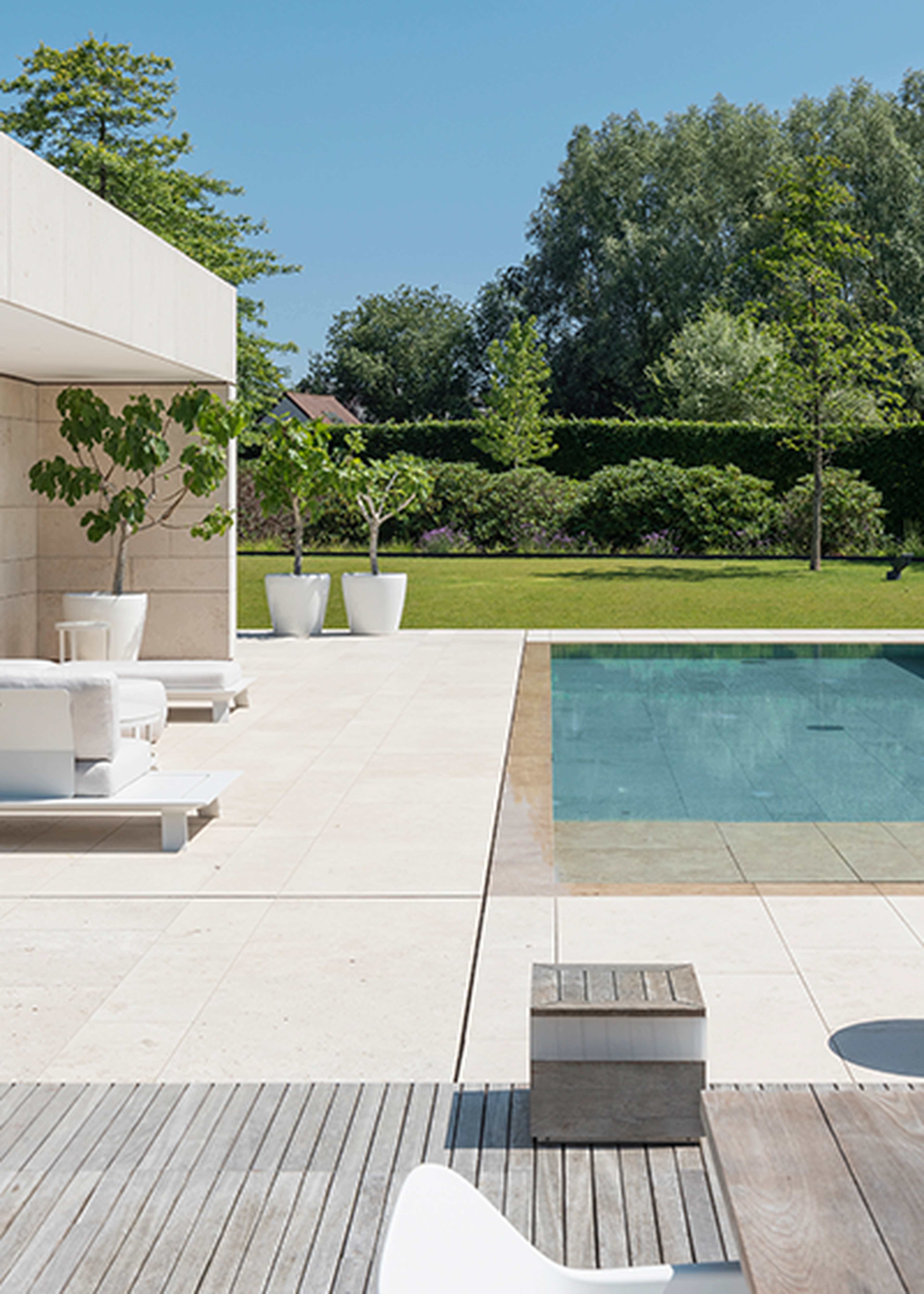 Płytki zewnętrzne i obrzeża basenu w Travertin Classic Beige (antico)