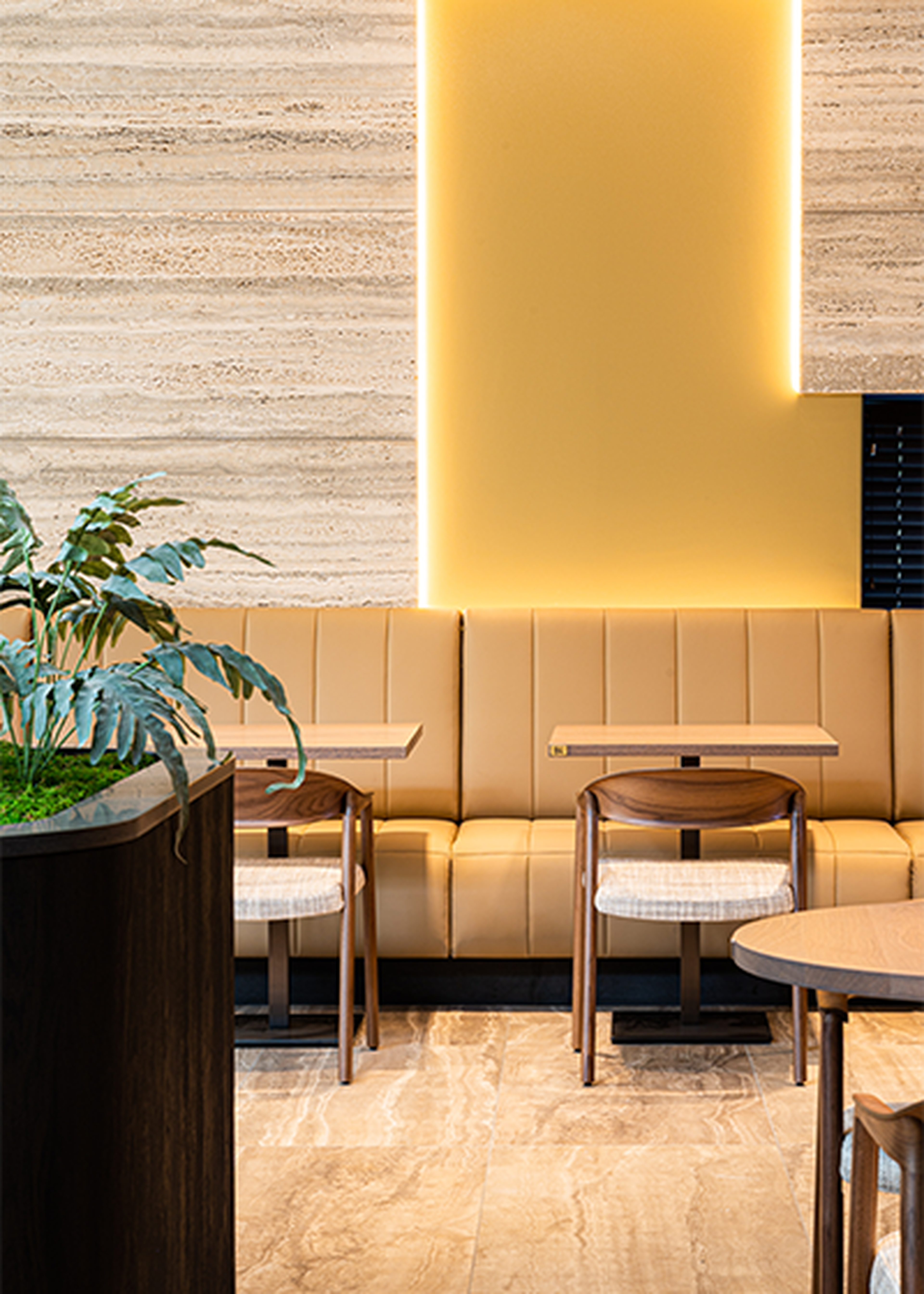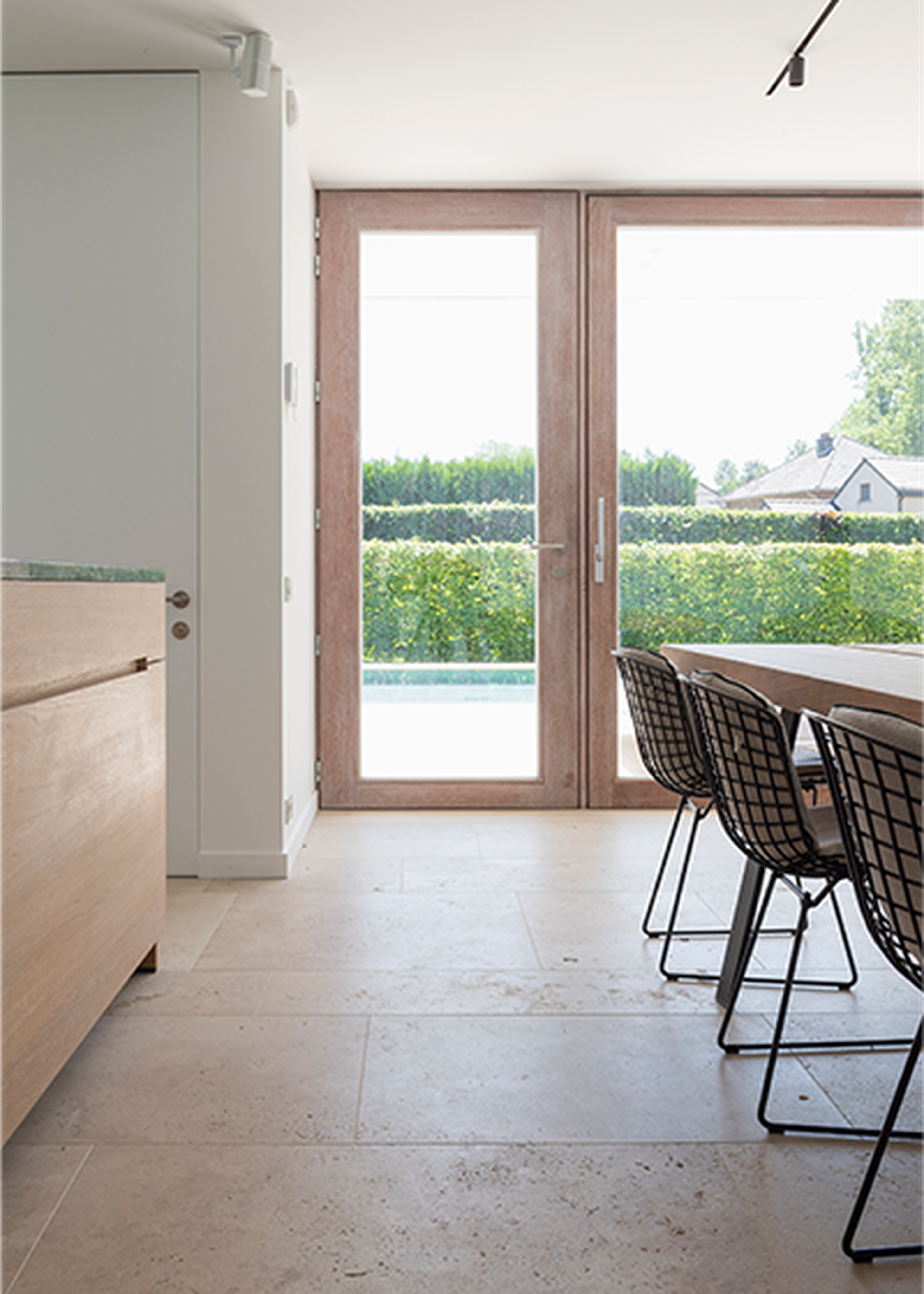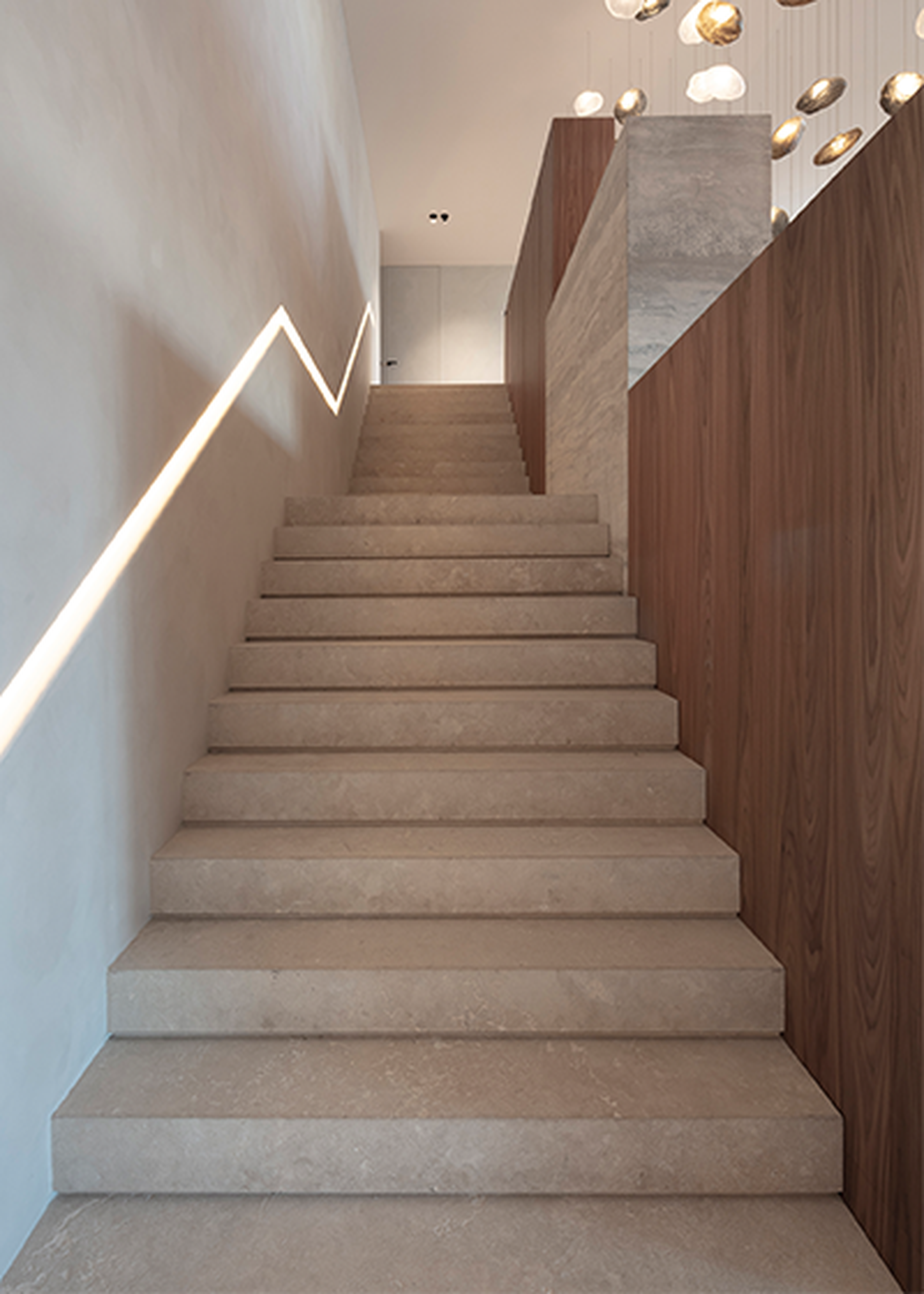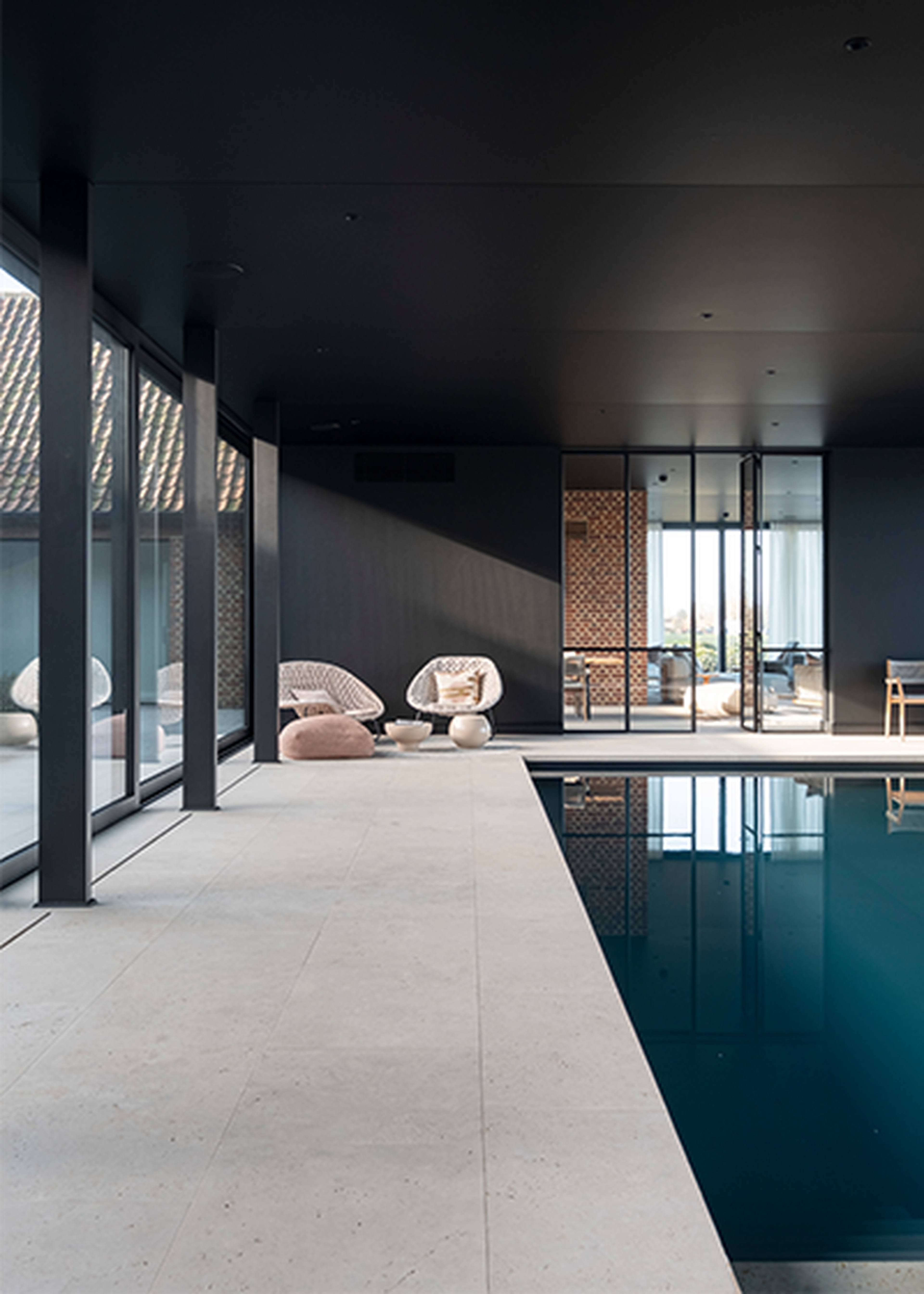 Remont HasHotel w Hasselt obejmował zarówno renowację, jak i rozbudowę. Część hotelu została zburzona i zastąpiona nową konstrukcją ze starannie ułożonych prefabrykowanych podłóg. Ten zrównoważony, elegancki i dynamiczny projekt z wyrafinowanymi detalami został stworzony przez agencję UAU Collectiv z siedzibą w Hasselt. I pomimo wyjątkowo wyrafinowanej fasady z pasami kamionki, to naturalny kamień kradnie show. Od chwili wejścia do HasHotelu nie ma ucieczki od trawertynu.