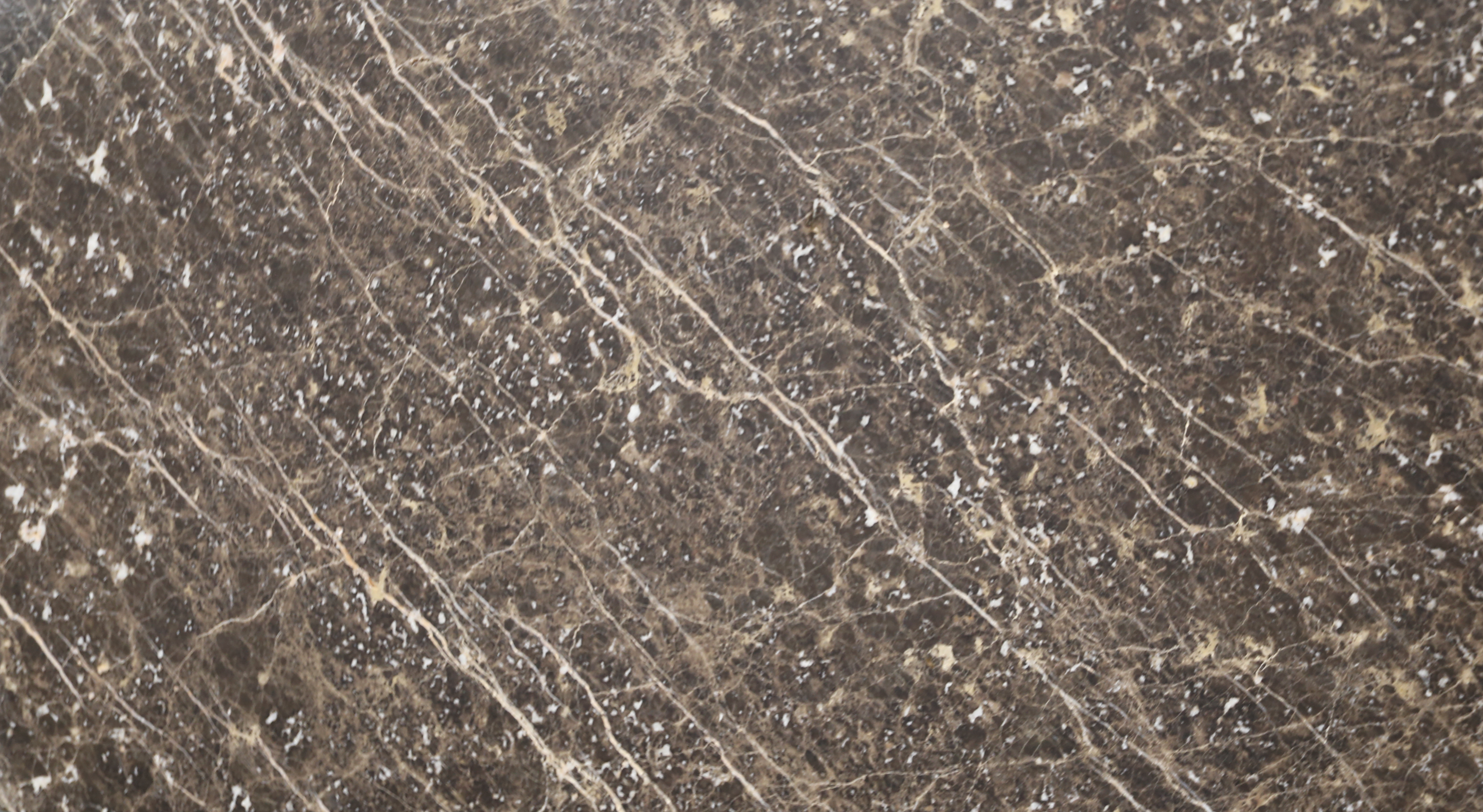 Opis:Marmur o ciemnobrązowym tle z rozproszonymi wąskimi i szerokimi, biało-beżowymi żyłkami .