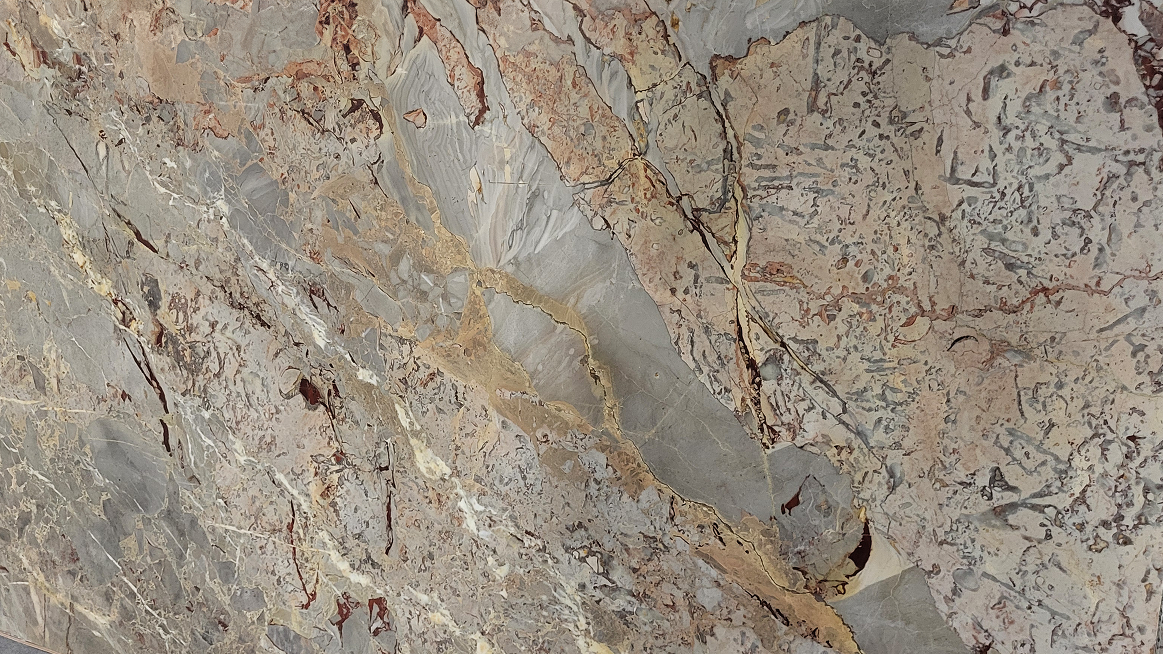 Opis:Tekstura Breccii (poszczególne kanciaste fragmenty oddzielone żyłkami) o barwie ciemnobeżowej do pomarańczowo-żółtej i rozproszone duże kanciaste szarobrązowe fragmenty. Zdecydowana większość skały jest drobnoziarnista, ale sporadycznie występują większe fragmenty wapienne. Białe i kolorowe żyły są rozsiane po całej skale.